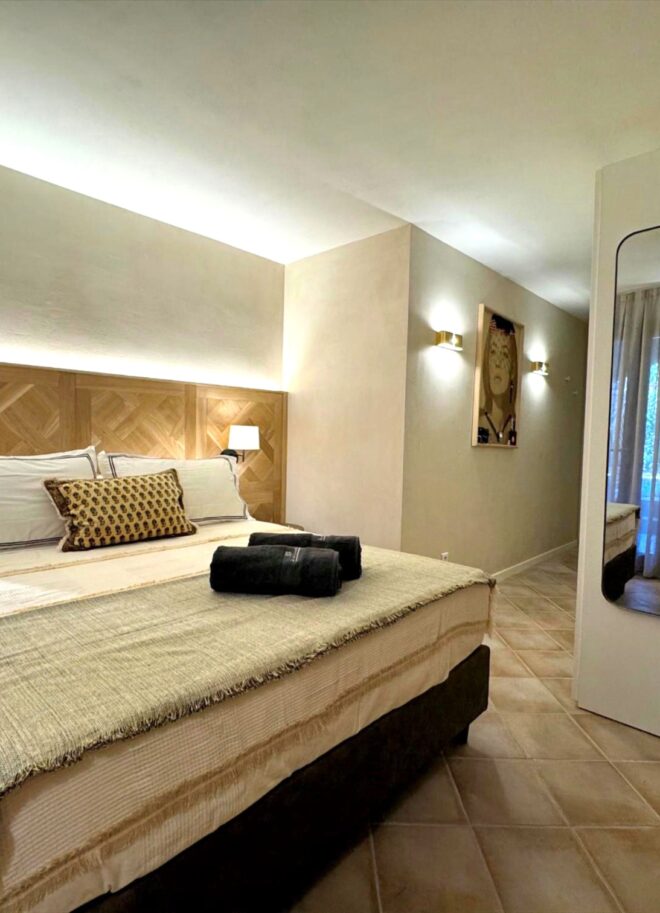 Inspirée par la plage de la Double, formée de deux baies jumelles taillées dans le granit, cette chambre offre une ambiance raffinée et cosy, idéale pour ceux qui recherchent un séjour de détente sur l’île de Cavallo.